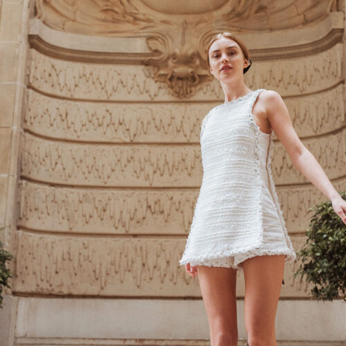 The Robe Lauriers dress sensually embellishes the feminine curve. Slightly flared, the dress has: a square neckline and thin straps, 2 invisible flat pockets on the sides and cuffs. Garnished with light silver lurex threads, the Robe Lauriers sparkles with a sober and chic refinement desired by Maison MOEM.