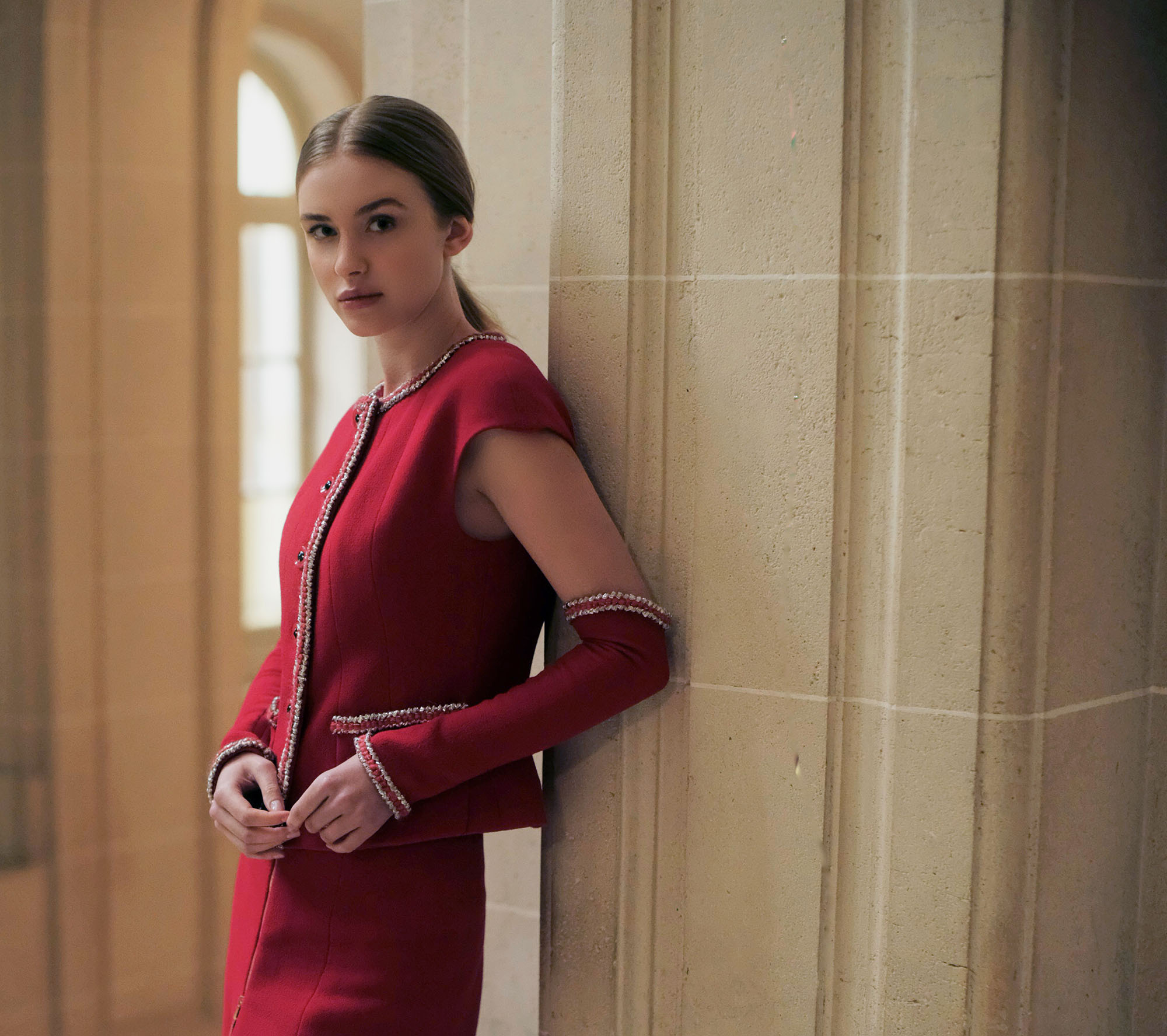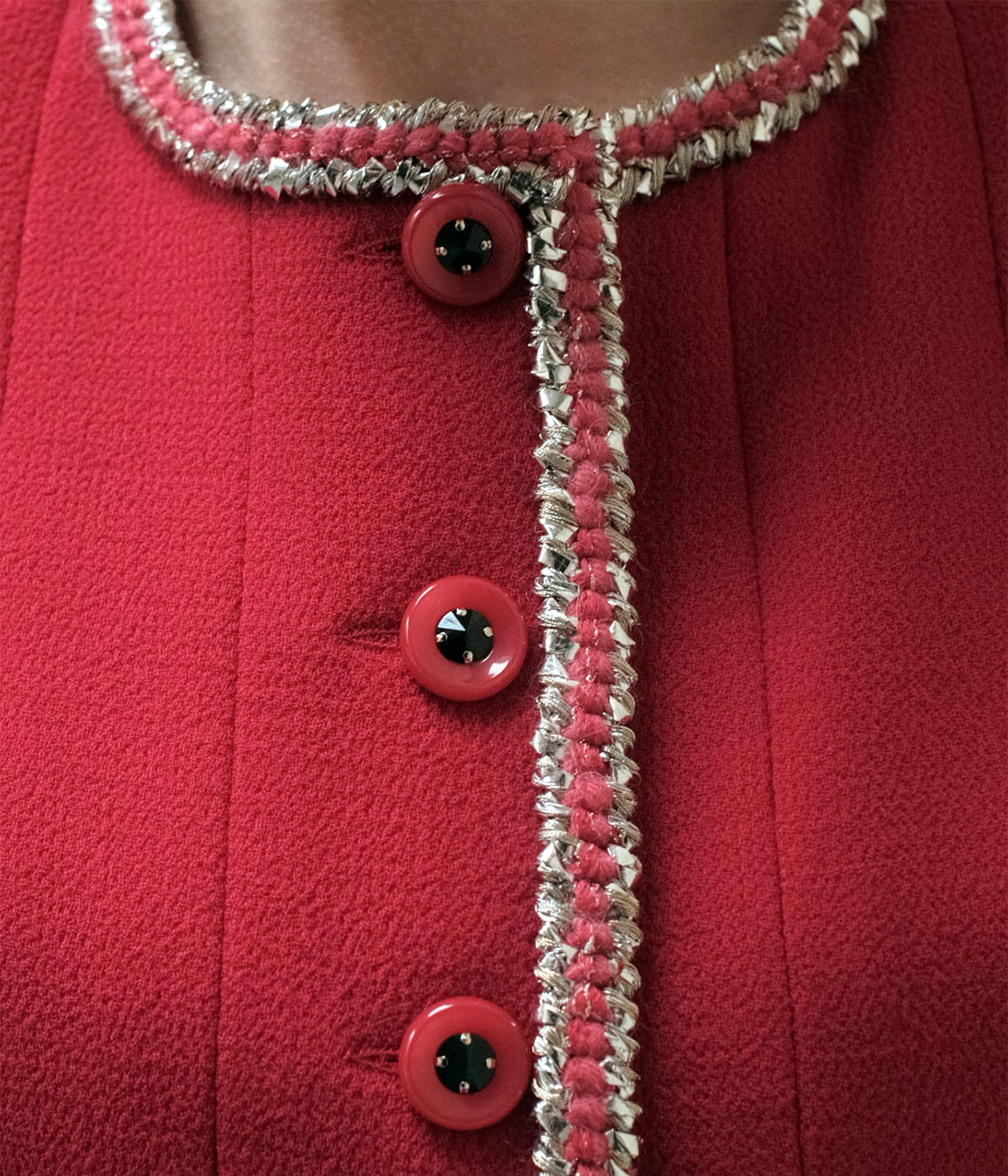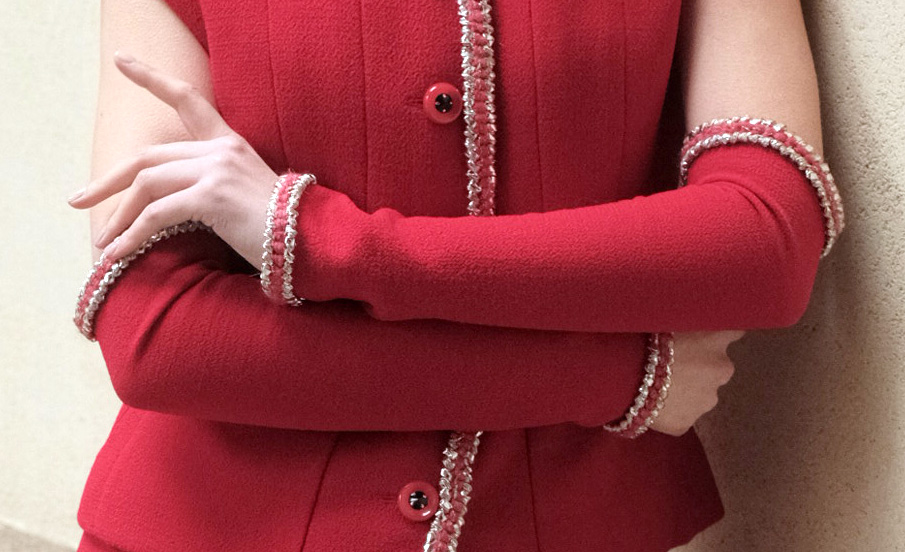 The Veste Canna boldly flatters the feminine look. Original and chic, the jacket multiplies the details. Cut slightly fitted at the waist, short sleeves with cuffs, the scarlet red Veste Canna doesn’t leave anyone indifferent. The work of golden and coral braided braid, the small brass chain as a border under the inner lining enhance the piece. 6 buttons closing the jacket on the front like precious rubies finely chosen by La Maison MOEM.