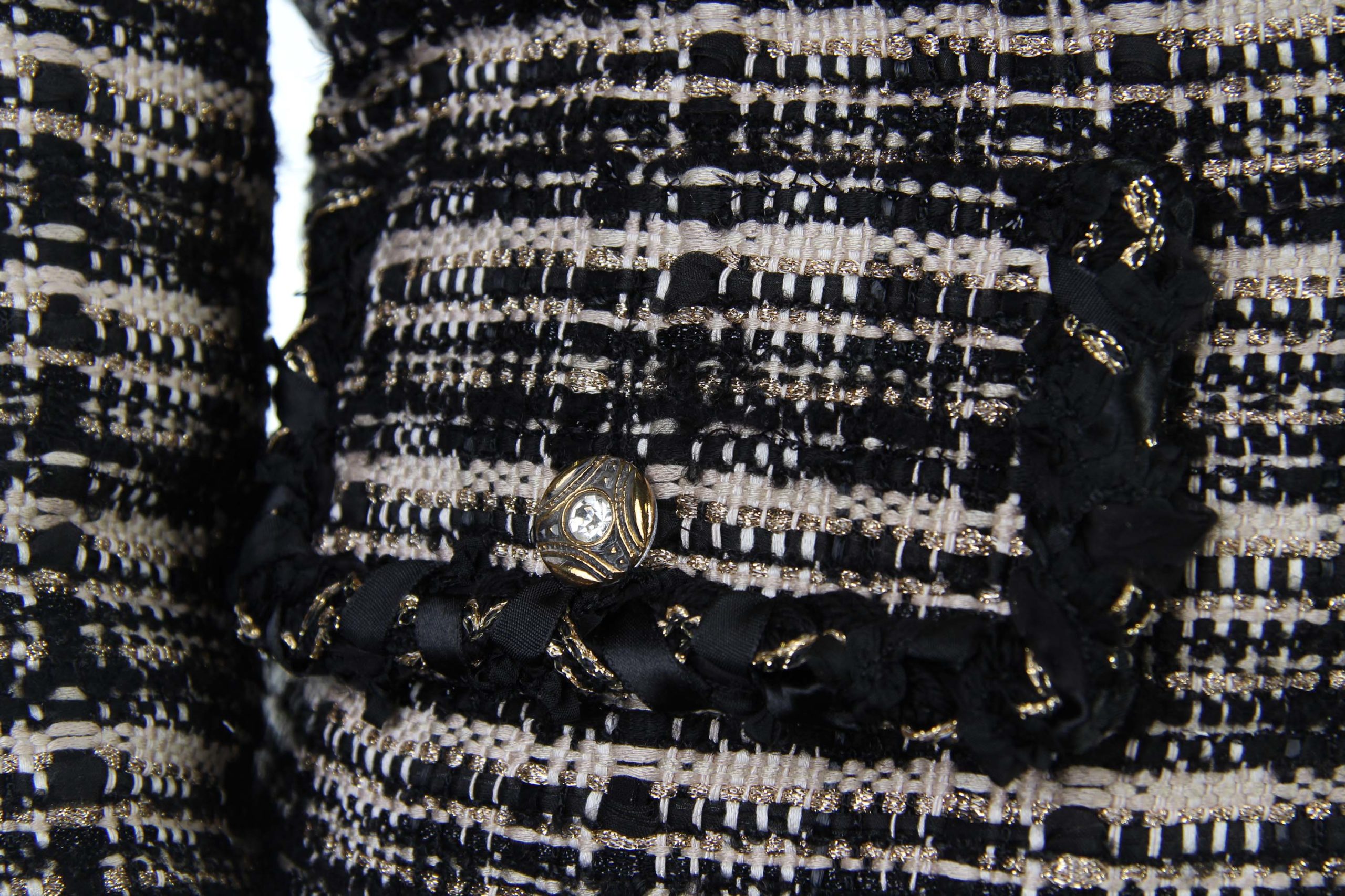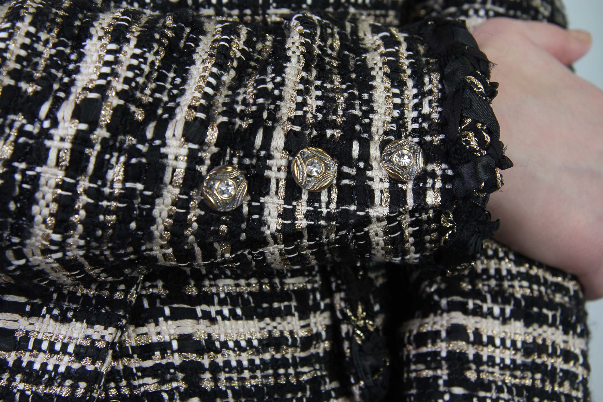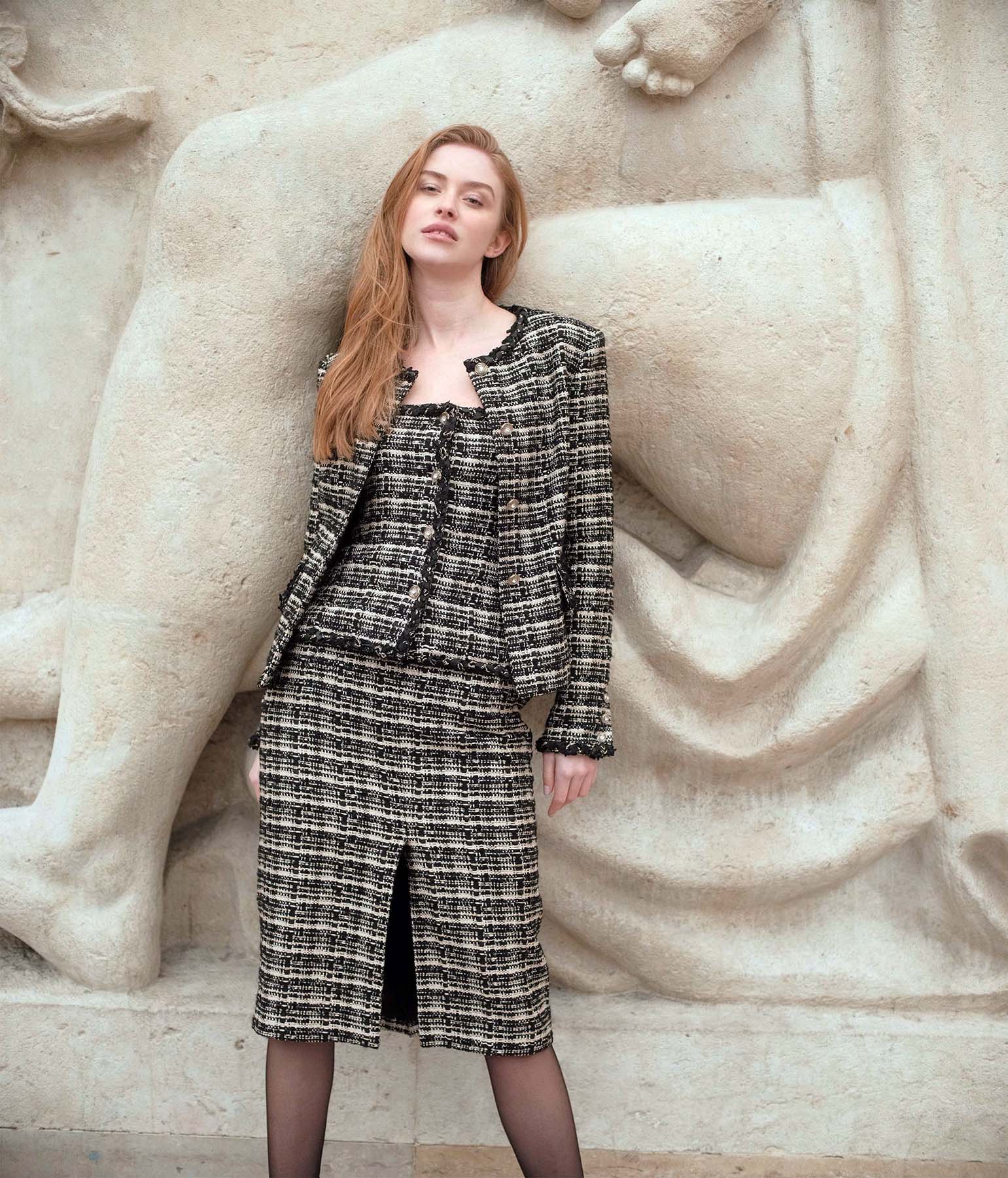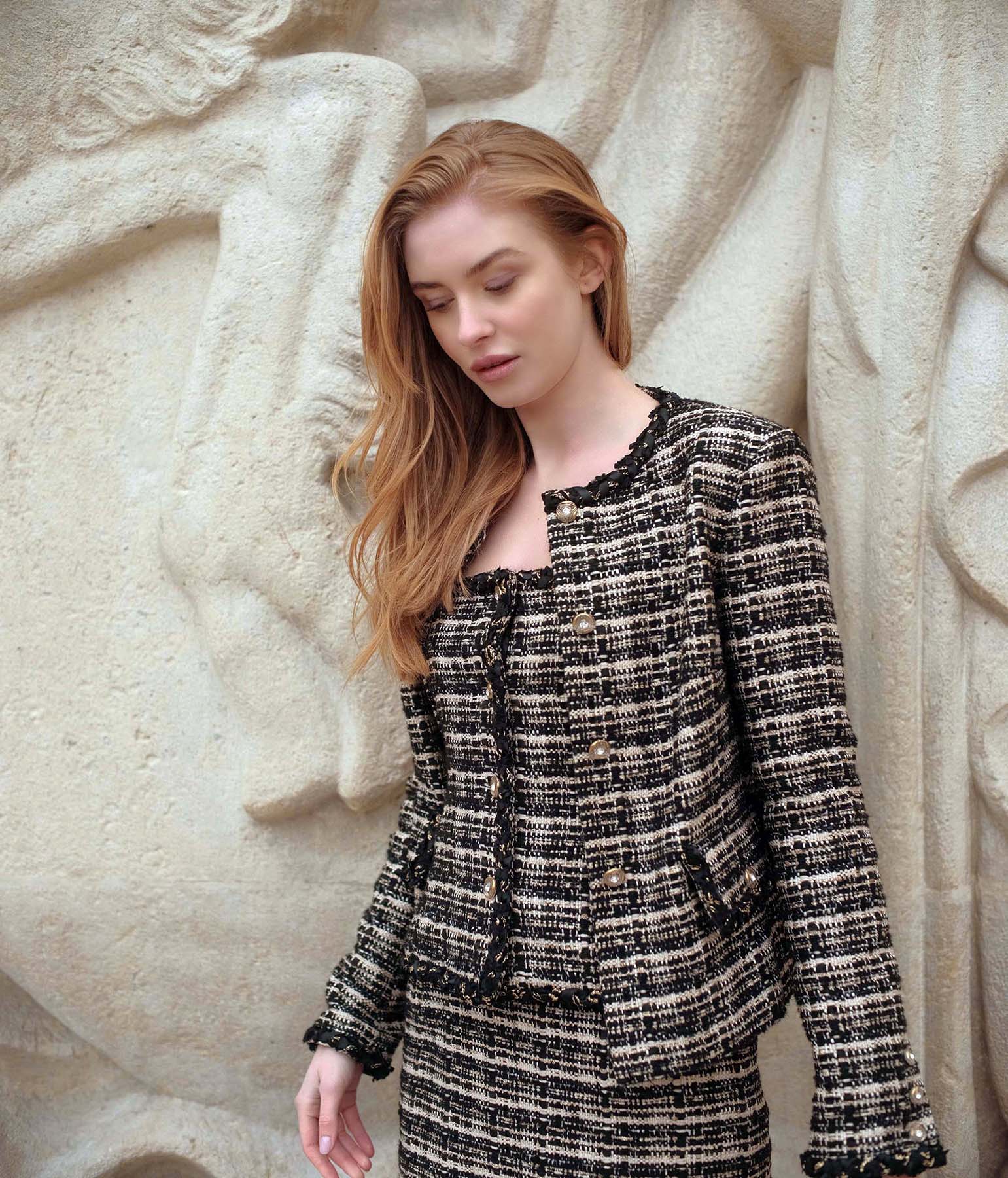 The Veste Gaillarde displays a sober and sophisticated refinement desired by Maison MOEM. The jacket’s round collar, flap pockets and sleeves are trimmed with hand-woven silk satin braid, gold lurex and dotted with black tulle flowers. The tweed with gradation of black, ecru and gold colors is embellished at its edge with a fine brass chain as an inner border. 12 buttons carefully chosen by La Maison mark the imprint of French chic style.