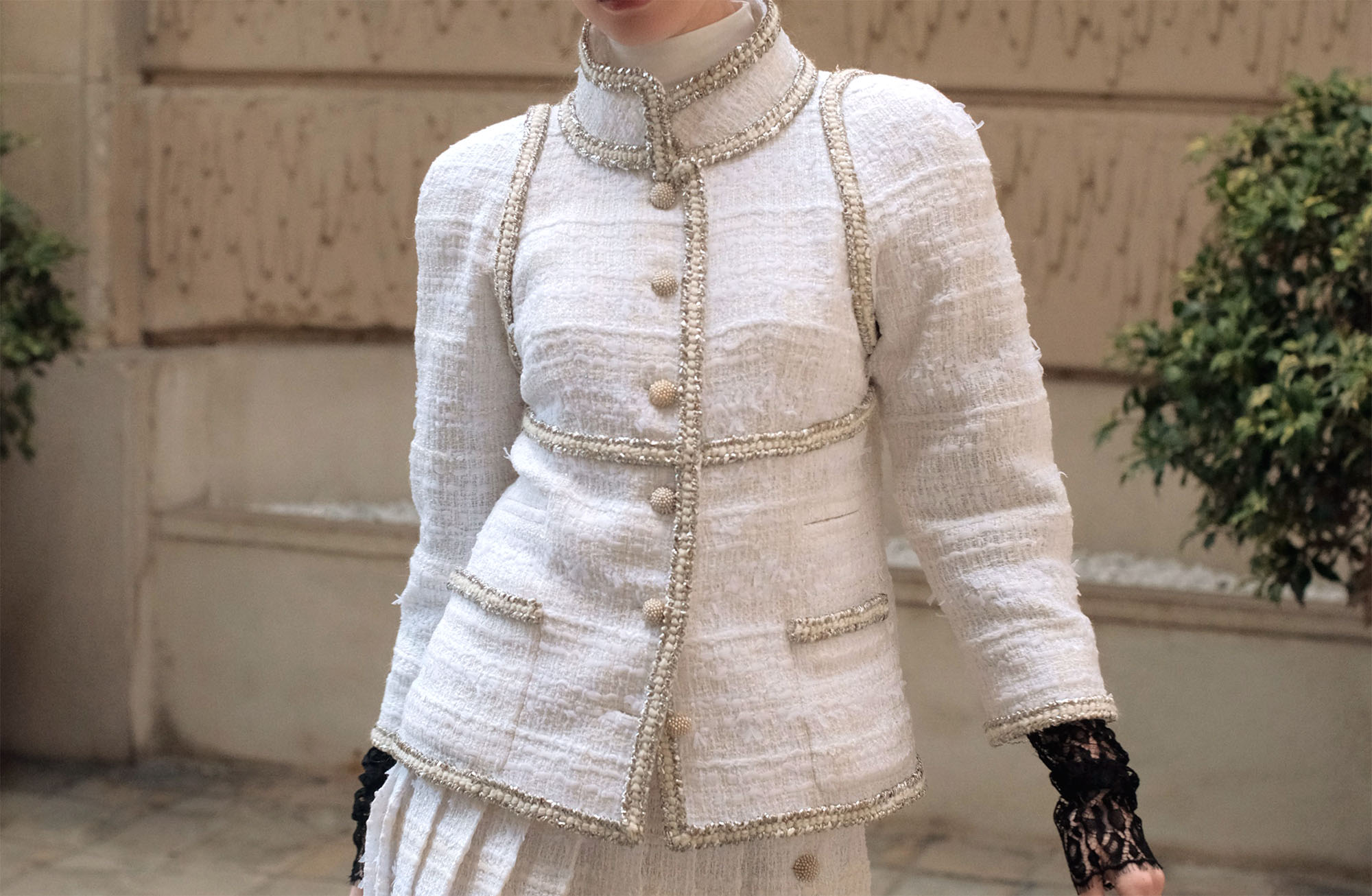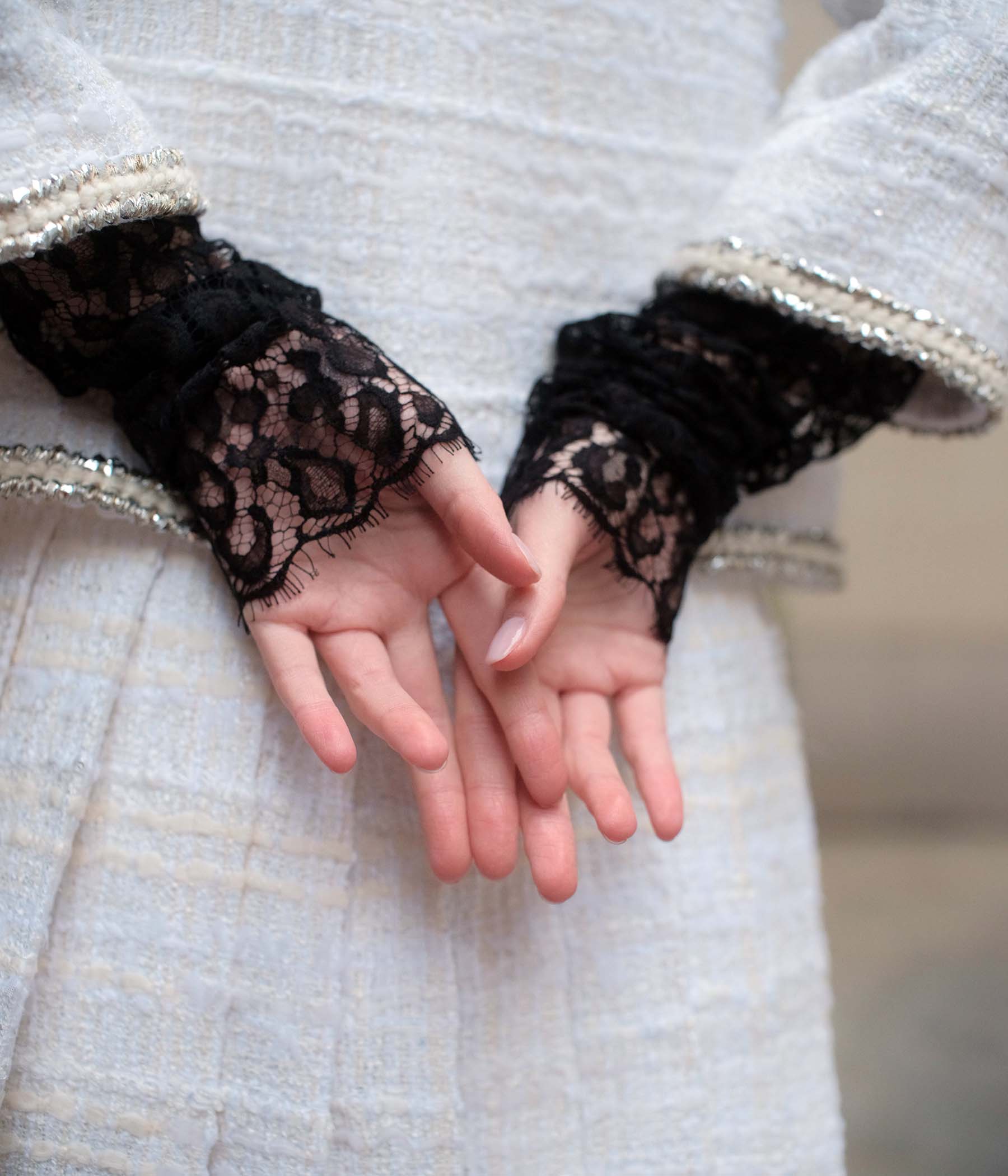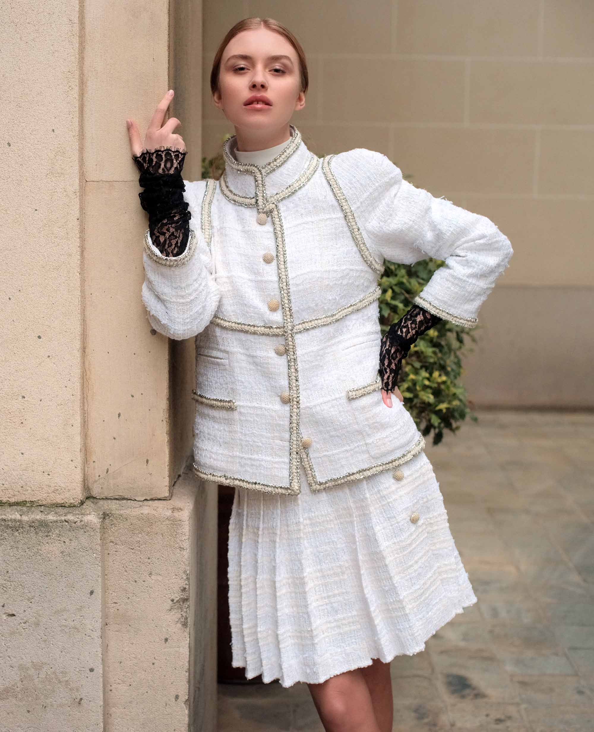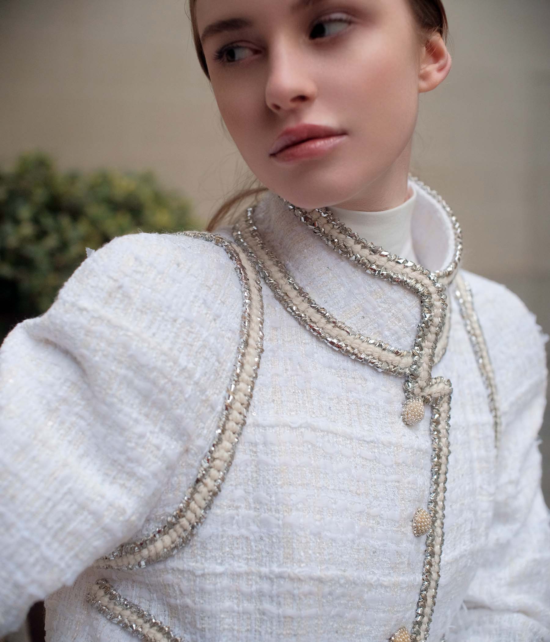 The Veste Gloire imagines a meeting between West and East. A classic cut all in ecru revisited by : kimono sleeves and the high mao collar . Braids decorated with silver lurex threads, 6 buttons forming a cluster of pearls crowned with Swarovski crystals and the thin brass chain as a border under the interior lining add all the sparkle to the jacket Gloire designed by Maison MOEM Paris.