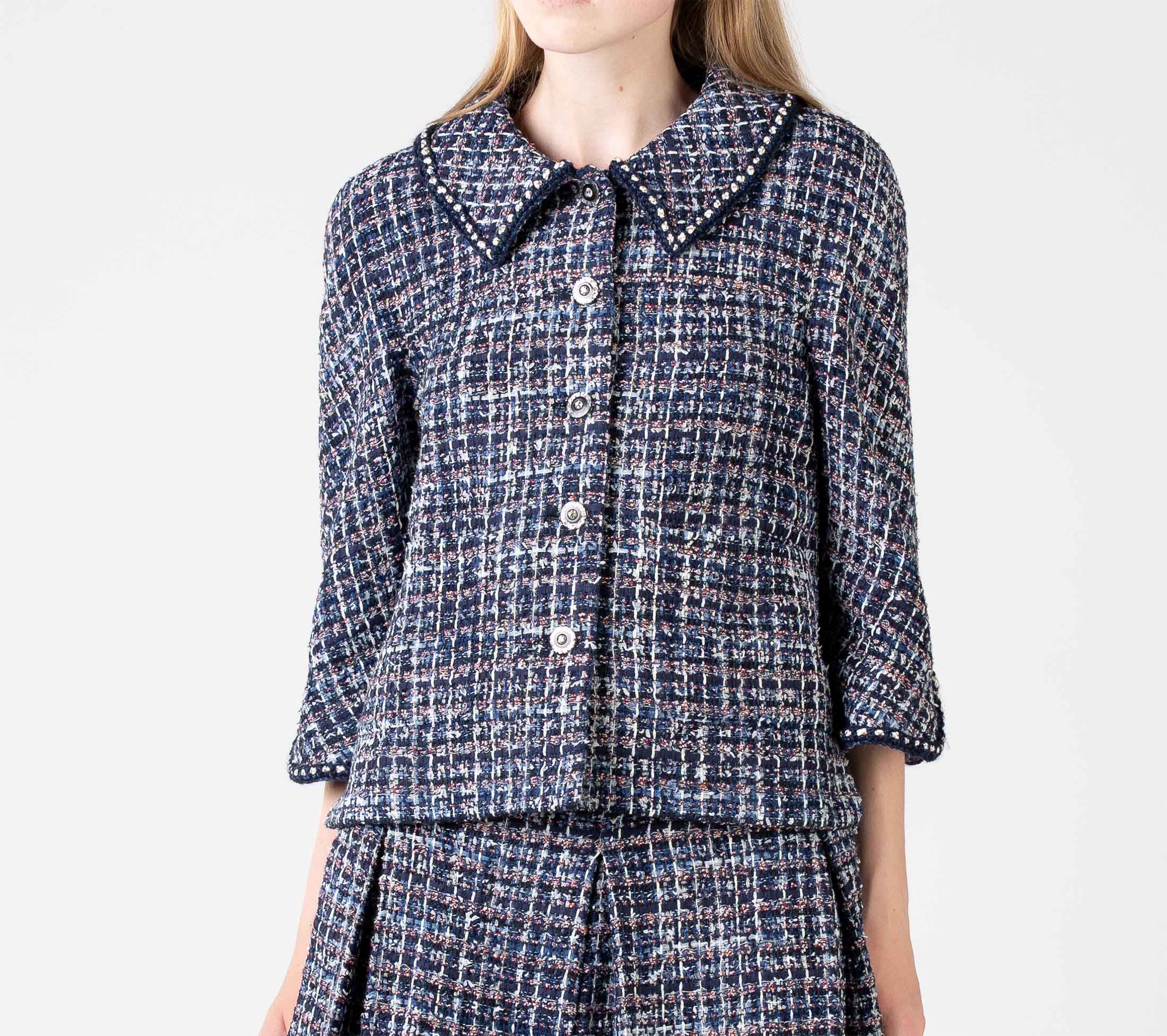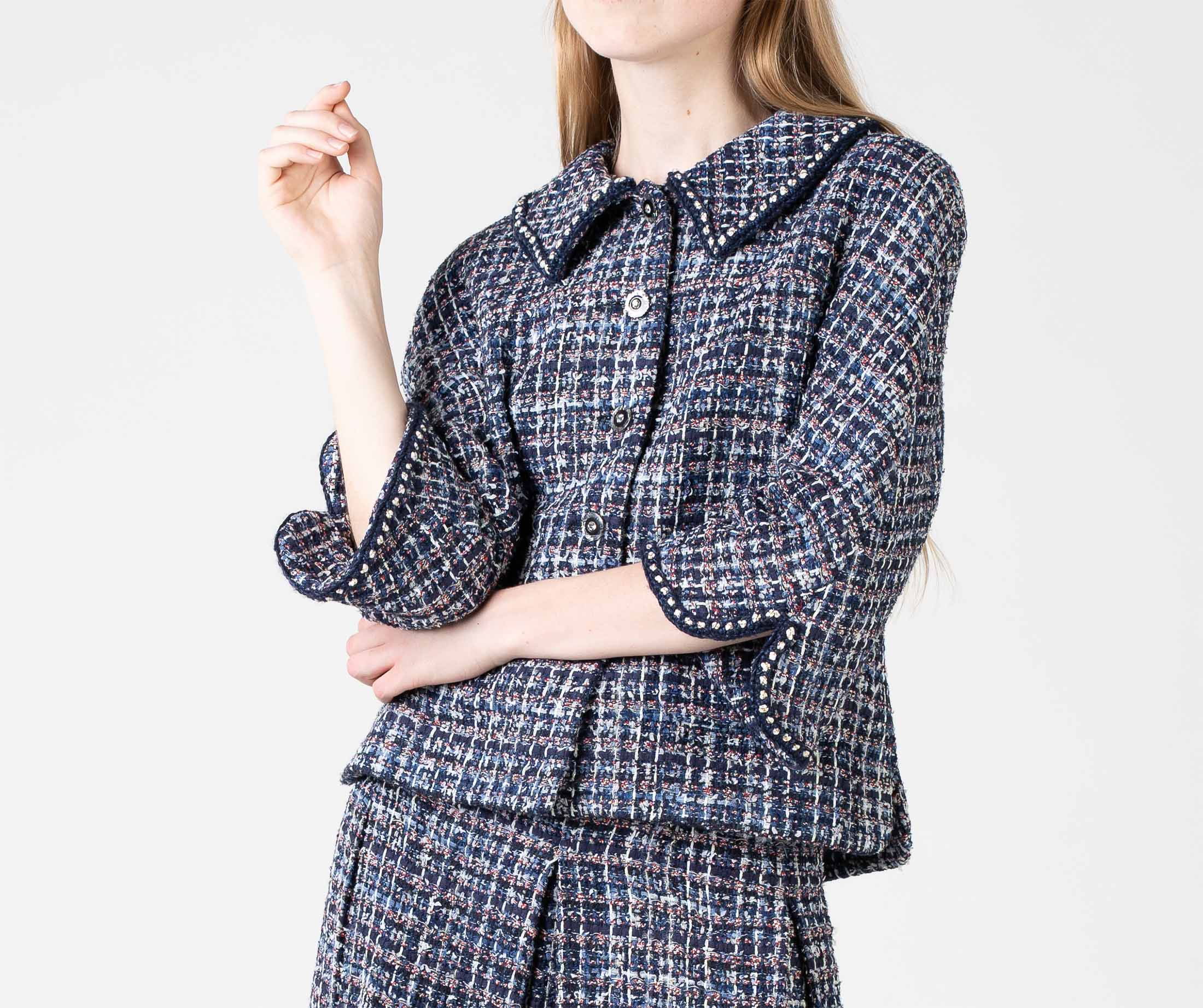 With the Veste Lys Jacket, Maison MOEM bets on a chic and elegant look. Kimono sleeves, blue tweed shaded with red and white touches, embellished with fine silver lurex threads. The collar and sleeve edges in hand-woven gold lurex braid, the 6 buttons and the fine brass chain as a border under the inner lining complete the feminine lightness of the Veste LYS.