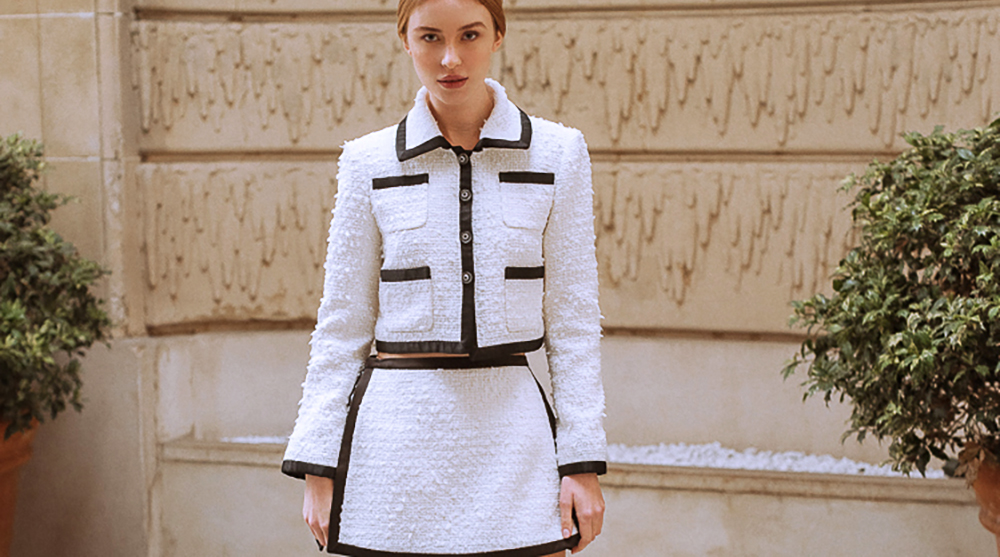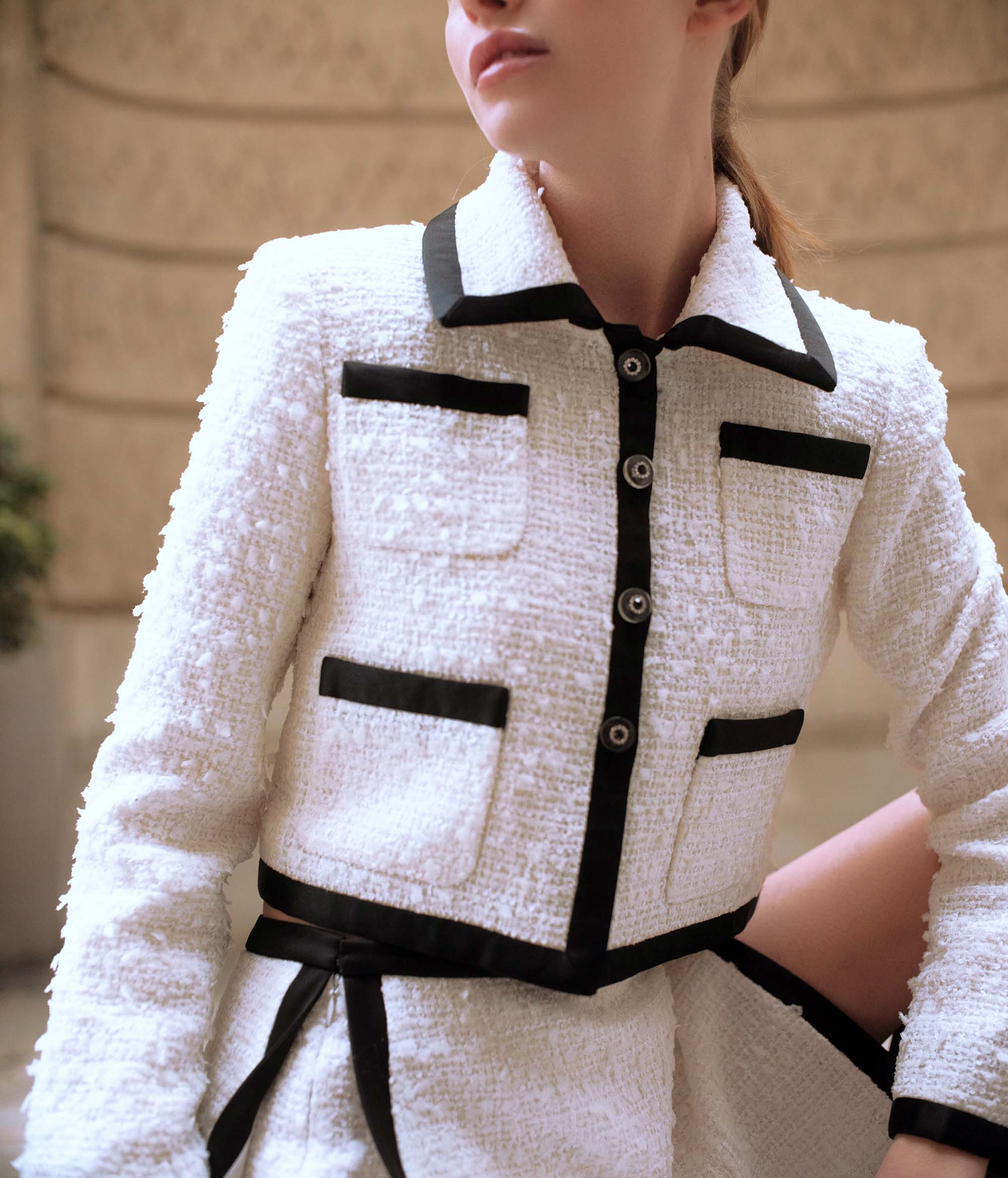 The Veste Valériane adopts a fresh and timeless attitude. Short, minimalist cut, made of a tweed dotted with handmade white tulle. Black silk satin edging on the sleeves, 4 pockets and the cutaway collar add to the sophistication of the Veste Valériane. 12 transparent buttons with a black center crowned with Swarovski crystals accentuate the signature of La Maison MOEM.