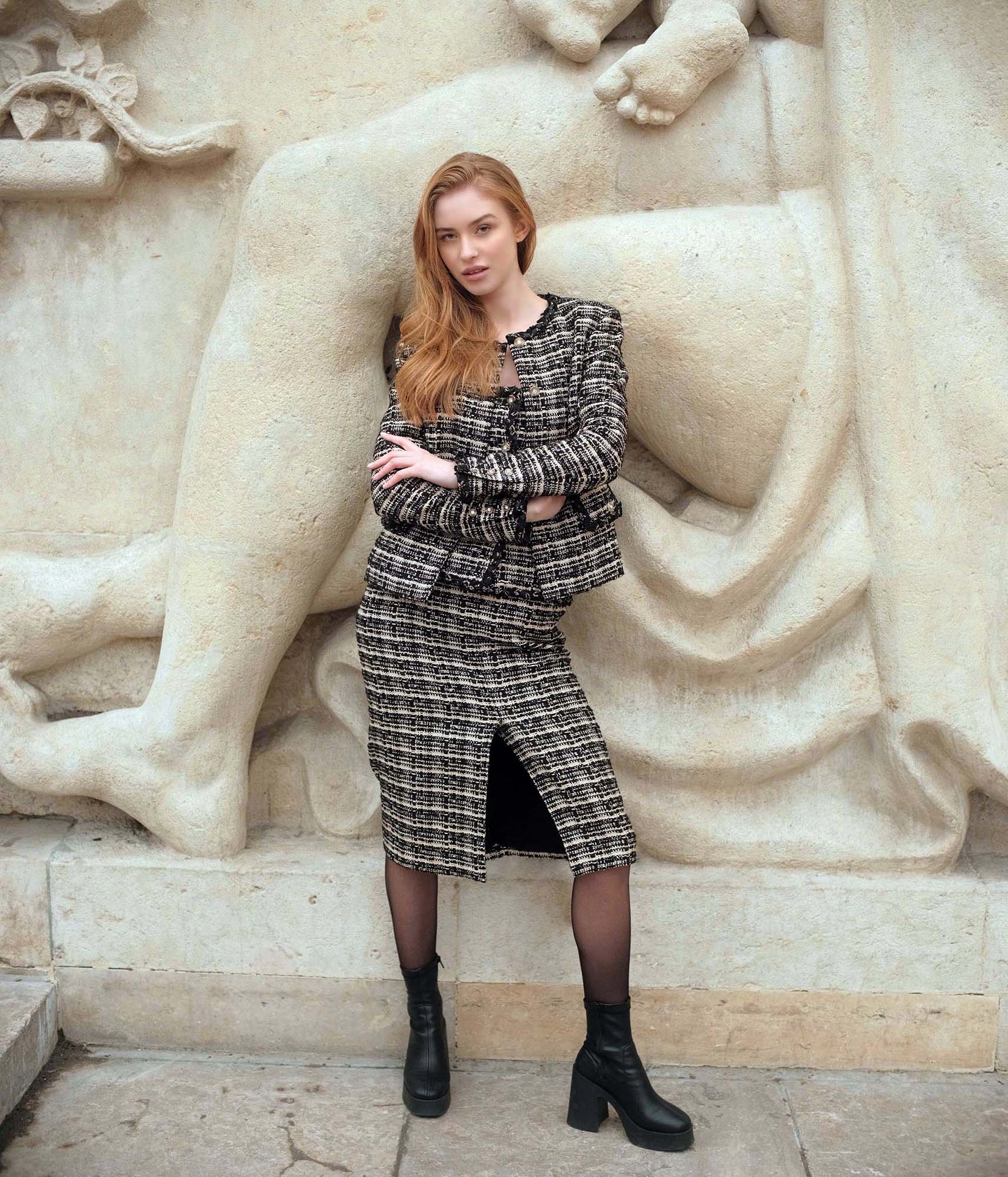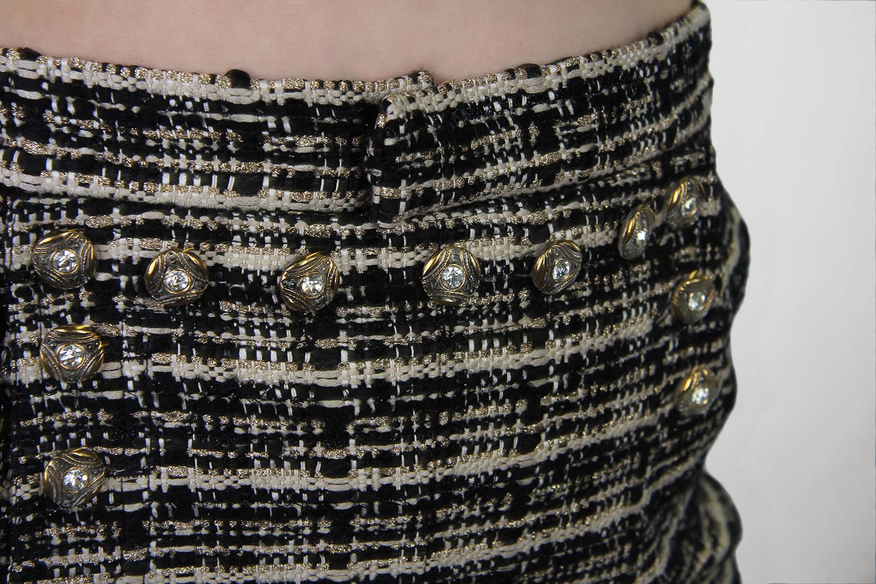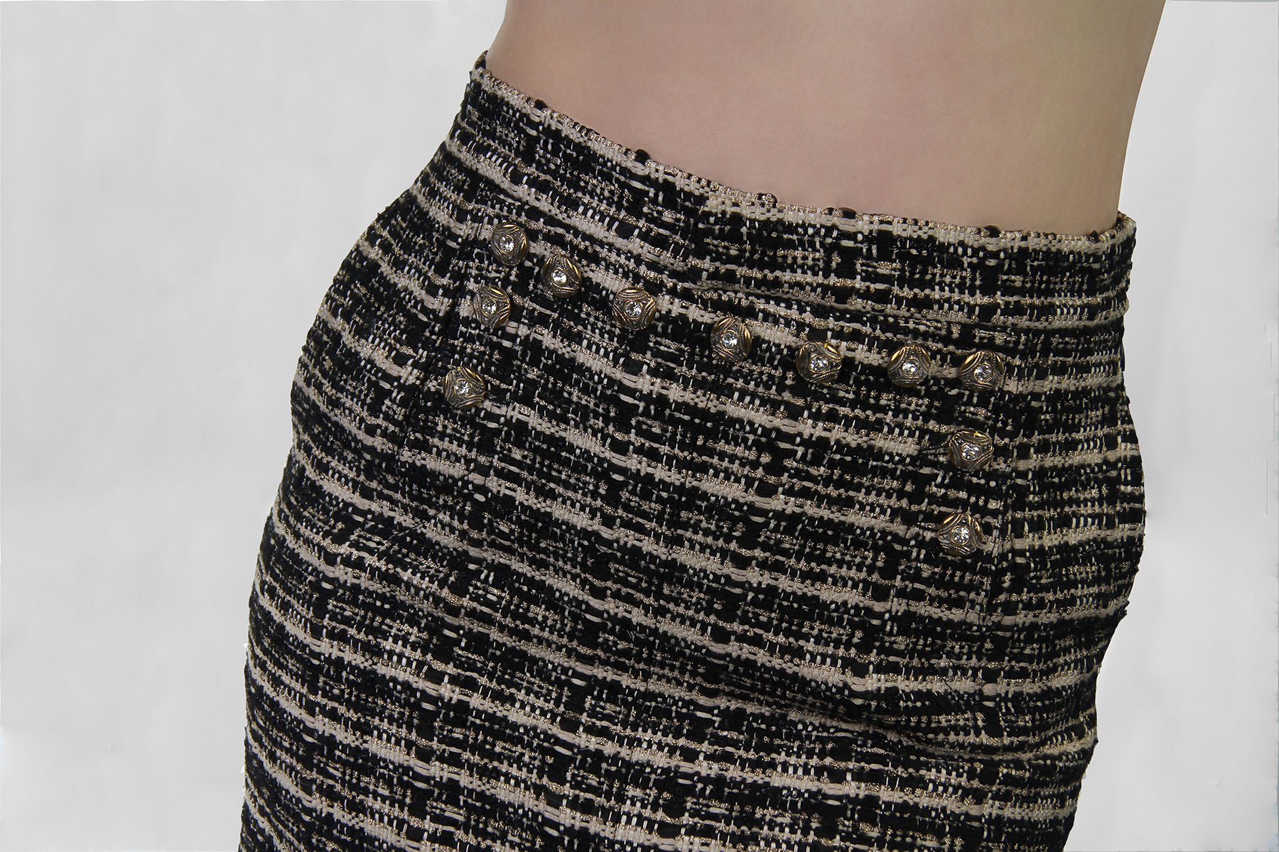 La longue jupe Gaillarde à coupe droite est pourvue d’une fente arrière lui conférant un esprit cocktail chic. Scintillante avec un dégradé noir, doré et écru, la jupe possède 2 poches plates et un zip invisible sur le coté, ainsi qu’une fermeture crochet à la ceinture couvert par une marinière ornée de 14 boutons à l’avant qui ajoutent à l’élégance de la jupe Gaillarde tout le raffinement de la Maison MOEM.