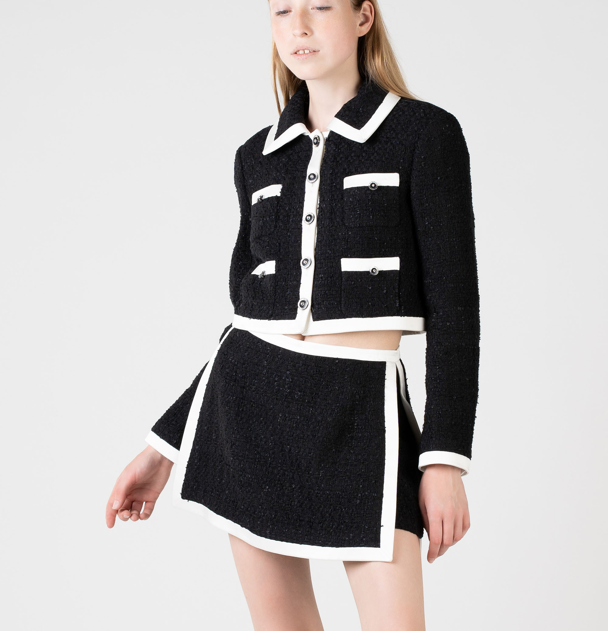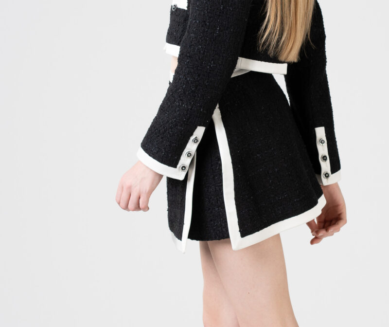 La jupe Valériane réinvente la jupe-culotte. Chic et décontractée, la jupe Valériane prête à la silhouette féminine un style preppy et romantique. Coupe trapèze qui allonge les jambes et fermeture invisible sur le côté. La jupe noire est bordée d’un ruban de soie satinée blanche et le tweed agrémenté de délicates tulles blanches. Une signature iconique de Maison MOEM.