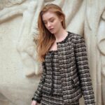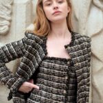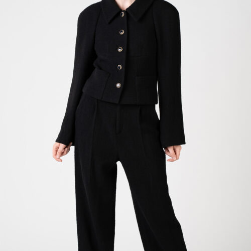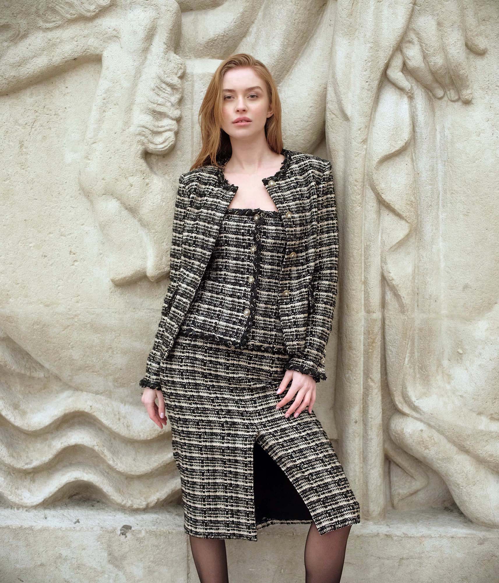 L’ensemble Gaillarde intemporel et indémodable offre à l’allure féminine un style rétro-glam. Composé de 3 pièces en tweed mélangés, le look Gaillarde revêt un motif étincelant nuancé de couleurs de noir, écru et doré. Le travail sur les galons fait main ainsi que leurs boutons précieusement sélectionnés viennent lui donner la touche sophistiquée de la Maison MOEM.