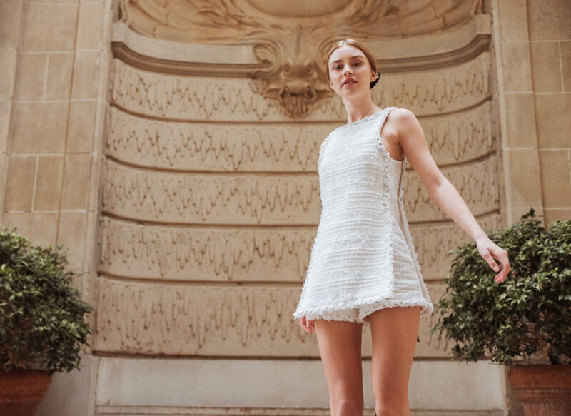 La robe Gardenia est une pièce rare créée par la Maison MOEM. Elle prête à la silhouette féminine un style à la fois urbain et romantique. Courte, sans manches, la robe combinant robe et culotte, se porte avec ses manchettes. Ficelée d’un relief de luxex argenté, la robe blanche Gardenia est fermée par un zip invisible sur le côté.