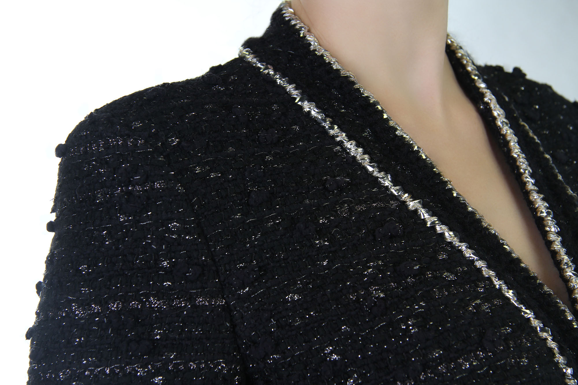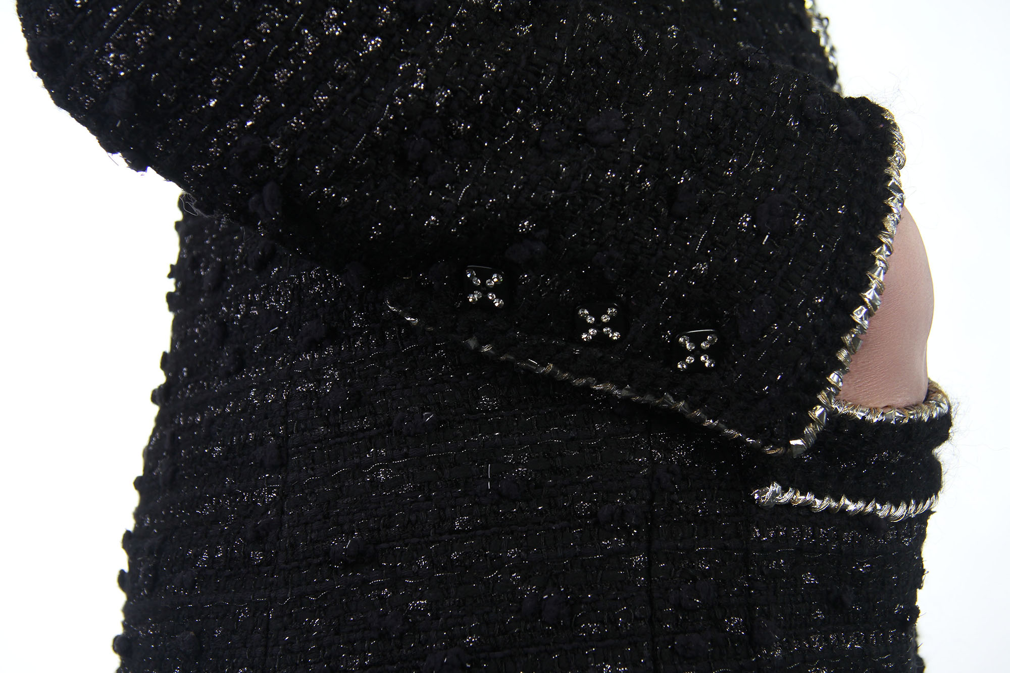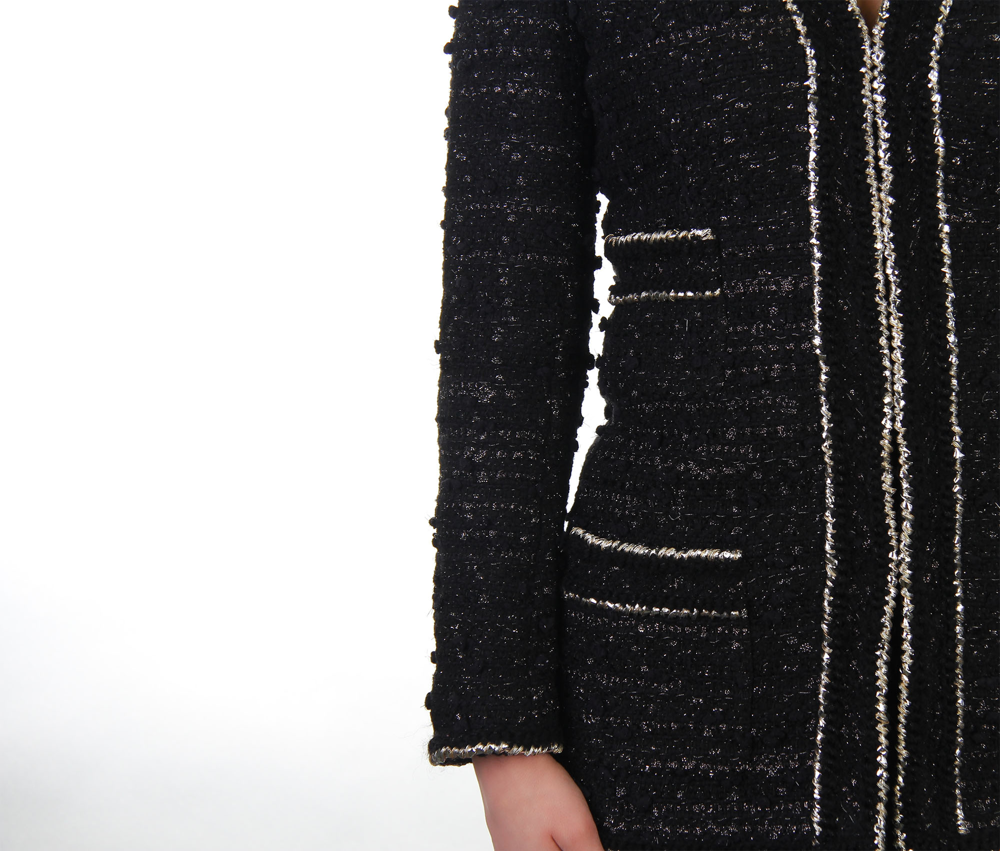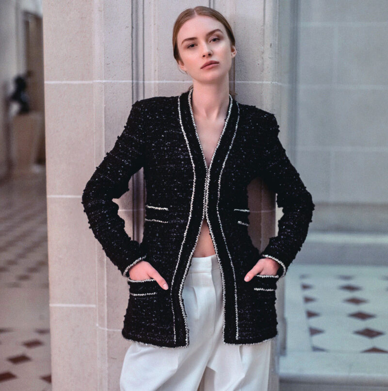 La veste Dora adopte une attitude minimaliste et chic. Noire pailletée, col v plongeant, cintrée la veste Dora possède une discrète fermeture à crochet. Bordée d’un fin fil de lurex argenté, et pourvue de 4 poches, les manches sont agrémentées de 3 boutons choisis par La Maison.